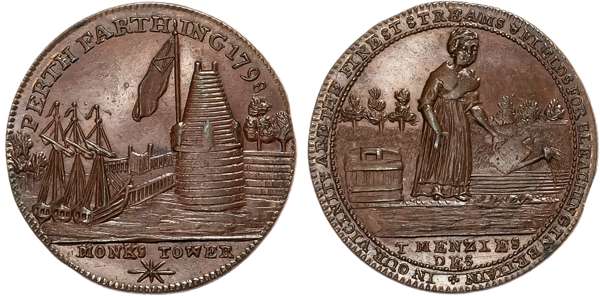 Perth. Perth , John Ferrier Farthing 1798, three ships at quay-side by conical tower (Monks Tower by the Tay, demolished …