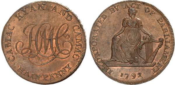 Co. Dub. Dublin , Camac Kyan and Camac (owners of the Hibernian Mining Company) Halfpenny 1792, Hibernia seated left, r …
