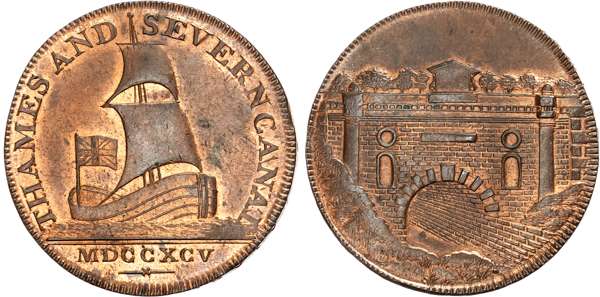 Glos. B rimscombe Port, Thames and Severn Canal Co. Halfpenny 1795, Sailing-barge, rev . View of Sapperton canal tunnel, …