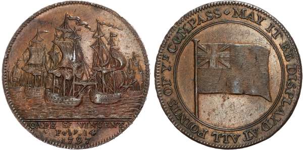 Hants. Portsmouth , General Circulation Halfpenny 1797, Blue Ensign, rev. Fleet or warships off Cape St. Vincent, edge A VALENTINE PRESENTED TO SPAIN BY ADML. JERVIS, 29.5mm/9.57gm. (DH 67), Extremely Fine, toned with remnants of mint brightness. Scarce .