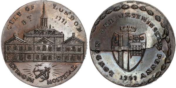 London , City Road , Prattent’s ‘London and Middlesex Series’ penny 1797, Lying-in Hospital rev . London and Westminster …