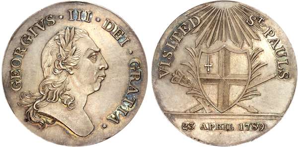 London , Political Series, Visit to St. Paul’s Silver Penny 1798, 32.75mm/9.29gm. (DH 177). Uncirculated, toning with superb blue iridescence in protected field, rare.