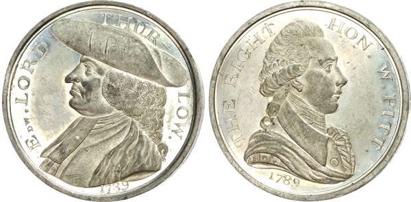 London , Political Series, White-metal Penny 1789, Bust of Lord Thurlow left, rev. Bust of prime-minister W. Pitt right, edge plain, 33mm/9.98gm. (DH 219). Uncirculated with original brightness.