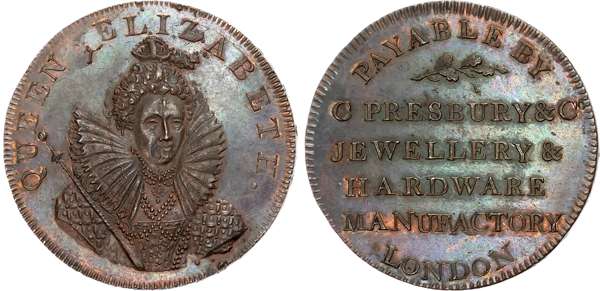 London , Covent Garden , Charles Presbury & Co. (jewellers) Halfpenny undated, Bust of Elizabeth I in high ruff almost facing, rev. 6-line legend, edge PAYABLE IN LONDON, 29.5mm/10.03gm. (DH 464). Usual obv. die flaws, otherwise virtually as struck, trace of lustre with dark glossy blue patina, almost proof-like, very rare. ‘ RR’.