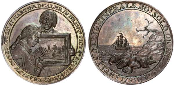 London , St. Martin’s Lane, Philip Ratley Halfpenny 1795, Connoisseur seated examining picture, rev . Sea shells on shor …