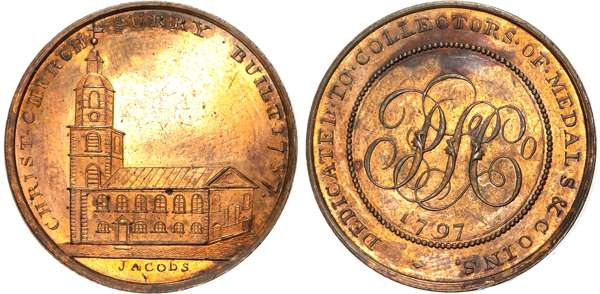 London , Holborn , Paul Skidmore’s ‘London Churches and Gates Series’ Halfpenny 1797, Christ’s Church, Southwark. rev. PSCo cypher, edge plain, 29mm/11.47gm. (DH 670). Uncirculated with full blazing original lustre.