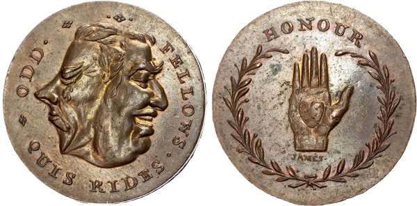 London, High Holborn, Thomas Spence Halfpenny, Head of George III conjoined with that of an ass ODD FELLOWS, rev. Heart in hand, edge plain, 28.2mm/8.85gm. (DH 804c). Extremely Fine, much brilliance and a trace of colour.