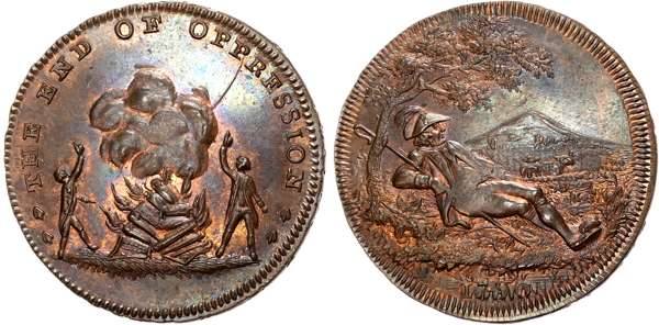 London, High Holborn, Thomas Spence Halfpenny 1790, The end of oppression, two men dancing around a fire, rev. Shepherd …