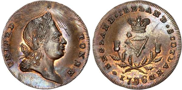 London, High Holborn , Thomas Spence Halfpenny 1796, Laureate head of George III, rev. Crowned harp, edge SPENCE DEALER IN COINS LONDON, 29.3mm/10.83gm. (DH 899). Good Extremely Fine, hints of underlying red and much iridescent lustre.