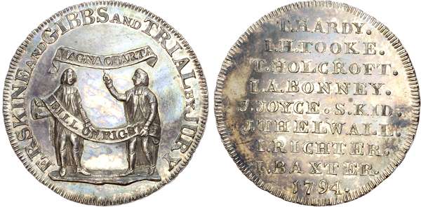 London, Political and Social Series , Erskine & Gibbs Silver proof Halfpenny 1794, Two barristers holding banner, rev. Names of jurors, edge engrailed. (DH 1011). Good Extremely Fine, toning with blue iridescence and brilliance, rare.