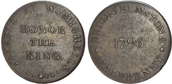 Suss. Brighton, W Mighell Halfpenny 1796, ‘HONOR YE KING’, rev. ‘BRIGHTHELMSTONE HALFPENNY’, edge plain, 22mm/5.99gm. (DH 10). About Extremely Fine for issue, scarce.