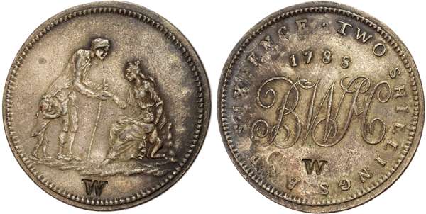 Warks. Birmingham , Workhouse , Gimblett’s silvered Two Shillings 1788, Counterstamped ‘W’ both sides, Charity seated, giving alms to an old man and a boy, a child kneeling by her side, rev cypher BWH, 1788 above, TWO SHILLINGS ( AND SIXPENCE obliterated) around, edge plain, plain, 36.2mm/19.12gm. (DH 2a), Silvering toning otherwise good Very Fine, very rare, ‘RR’.
