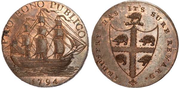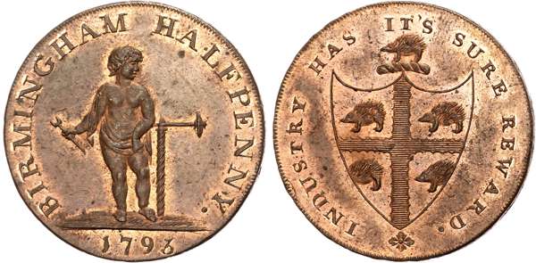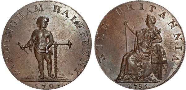 Warks. Birmingham , Kempson’s Halfpenny 1797, Boy standing holding an auger and spanner, rev. hedgehog crest and arms, edge CURRENT EVERYWHERE, 29mm/11.53gm. (DH 50). A mule Kempson Halfpenny 1795 with rev. Britannia seated left, edge diagonally milled, 28mm/9.14gm. (DH 53). A mule Kempson Halfpenny 1794 with rev. a sailing ship right, edge plain, 29mm/8.68gm. (DH 59). All good Extremely Fine, first two with considerable amounts of original mint lustre, third bronzed and iridescent, second rare. [3]