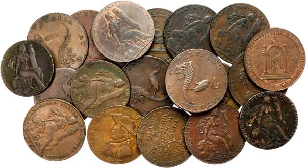 Warks. Birmingham , John Allin, Halfpenny, 1796, 10.87gm., (DH 62); Henry Biggs, Halfpence (3), 1792, 11.16gm. (DH 70), undated (2), 11.35gm. (DH 71); 11.02gm., (DH 71a); Birmingham Mining & Copper Co, Halfpence (7), 1791 (2), 13.80gm., (DH 77); 13.09gm., (DH 83), 1792 (5), 12.41gm., (DH 85); 13.85gm., (DH 88); 15.00gm., (DH 91;, 13.31gm., (DH 92); 13.56gm., (DH 113); Imitation Halfpenny, 1792, 10.74gm., (DH 103); Birmingham Coining & Copper Co, imitation Halfpence, 1794 (6), 9.48gm., (DH 73); 10.11gm., (DH 73a); 10.78gm., (DH 74d); 10.25gm., (DH 75b); 12.01gm., (DH 75c); 9.35gm., (DH 75d); James Bisset, Halfpenny, with pictures, 10.38gm., (DH 120); Donald & Co, Halfpenny, 1792, 9.69gm., (DH 123). DH 83 and 120 good Extremely Fine with a hint of original colour, others generally Very Fine [20].