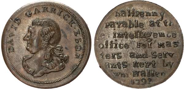 Warks . B irmingham , William Hallan, Skidmore’s mule Halfpenny 1795, Bust of Hallan left, rev . ruins of St Paul’s Covent Garden, edge SKIDMORE HOLBORN LONDON, 29mm/12.43gm. (DH 135); Halfpenny 1792, Servants 8-line legend, rev . Bust of David Garrick left, edge plain, 31mm/11.29gm. (DH 139a). Both good Extremely Fine and toned . [2]