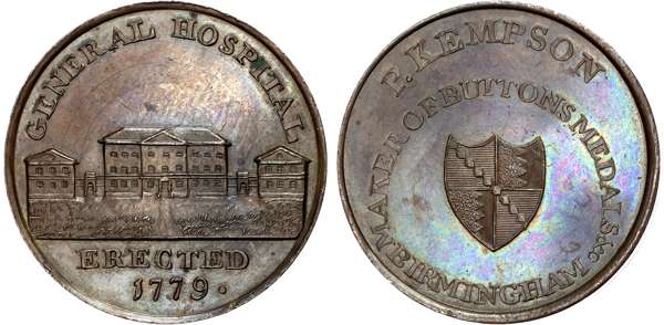 Warks. Birmingham , P Kempson’s Series of Birmingham Buildings Halfpence, St. Bartholomew’s Chapel, edge plain, 29.1mm/14.32gm. (DH 150). St. Mary’s Chapel, edge plain, 29.1mm/11gm. (DH 156). The Old Meeting Destroyed, edge plain, 29.1mm/14.06gm. (DH 160). Old as Meeting Rebuilt, edge plain, 29mm/12.67gm. (DH 162). St. Paul’s Chapel, edge plain, 29mm/12.6gm. (DH 172). St. Philip’s Church, edge plain, 29.1mm/11.5gm. (DH 174). General Hospital, edge plain, 29.3mm/11.6g. (DH 180). All good Extremely Fine, generally toned with underlying brilliance - DH 172 and 174 with trace of lustre , [7]