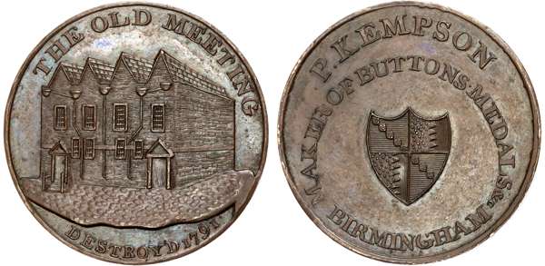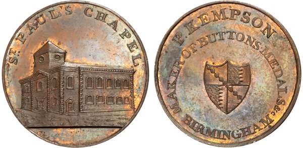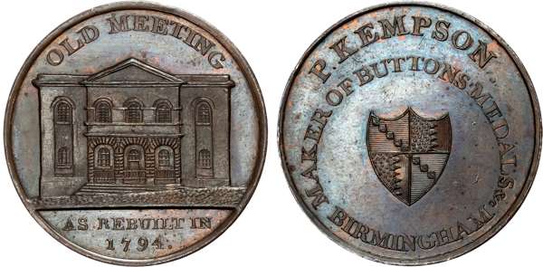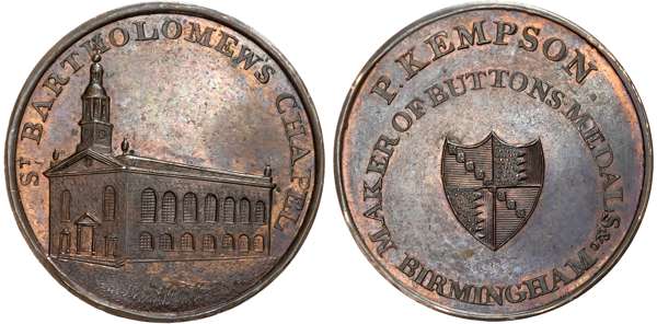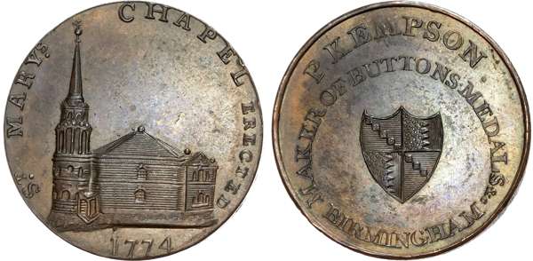 Warks. Birmingham , P Kempson’s Series of Birmingham Buildings Halfpence, St. Bartholomew’s Chapel, edge plain, 29.1mm/1 …