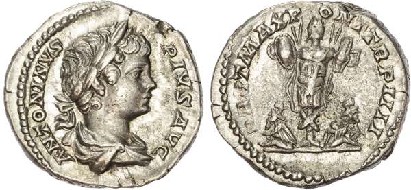 ANTONINVS PIVS AVG, laureate and draped bust of Caracalla right. Rev. PART MAX PONT TR P, trophy flanked by two bound captives. (RIC 63; RSC 178). Good Very Fine.