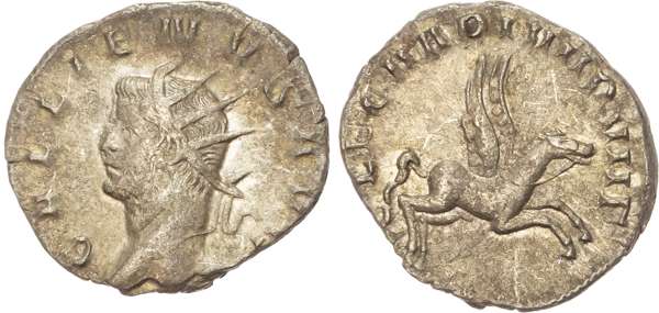 GALLIENVS AVG, radiate head of Gallienus left. Rev. LEG II ADI VII P VII F, Pegasus springing right. (RIC 326; MIR 36). Good Very Fine for issue. Rare left facing head.