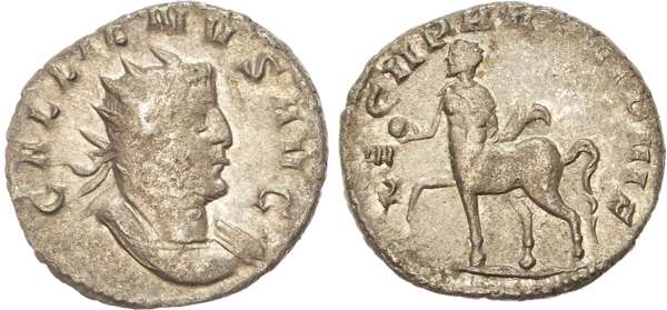 GALLEINVS AVG, radiate and cuirassed bust right. Rev. LEG II PART VI P VI F, centaur walking left, holding globe and club. (RIC 334; MIR 36, 999n; RSC 480). Good Very Fine. Scarce.
