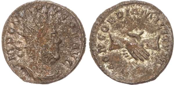 IMP MARIVS P F AVG, radiate, draped and cuirassed bust right. Rev. CONCORDIA MILIT, clasped hands. (RIC 4). Fine. Some silvering.