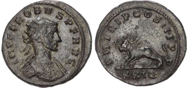 IMP C PROBVS P F AVG, radiate and cuirassed bust right. Rev. PM TR P COS III P P, radiate lion advancing left, with a thunderbolt in its jaws. (RIC 616). Very Fine.
