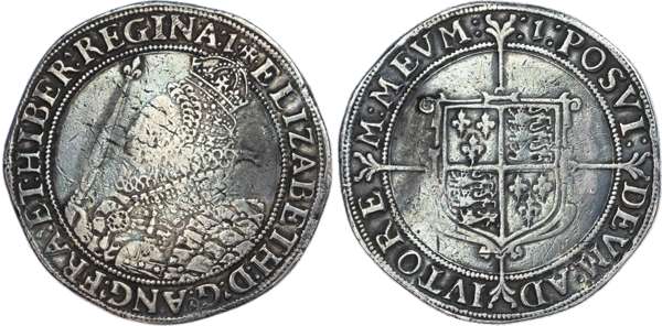 Elizabeth I (1558‑1603), Crown, seventh issue, mintmark: 1 (1601). Ornate crowned bust left, holding orb and sceptre, crown breaks inner beaded circle, reads ELIZABETH DG ANG FRA ET HIBER REGINA 1. Rev, long cross fourchée under quartered shield of arms, legend surrounds 1 POSVI DEVM AD IVTORE M MEVM, 29.30gm (S. 2582; N. 2012). Top left of shield plugged, resulting in minor protuberance behind Queen’s head, Near Very Fine for issue.