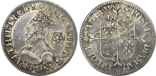 Elizabeth I (1558‑1603), Milled coinage, AR sixpence 1562, mm. star. Crowned bust left with plain bodice, rose behind, rev. Long cross fourchée over Royal Arms, 3.03gm. (N.2205; S.2594). Very Fine and lightly patinated.