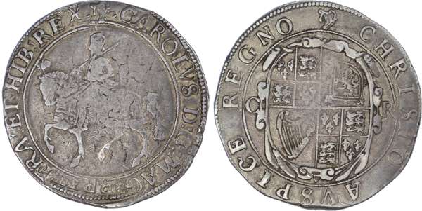harles I (1625 ‑1649), AR Halfcrown, 14.96gm., Tower Mint, group II, second style horseman, type 2c, - smaller horse, king with sword over shoulder, cross on housings, rev. oval quartered shield of arms dividing CR, mintmark a harp ‑ 1632‑33. (cf Brooker 310; N.2207; S.2771). Weakly struck but almost Very Fine