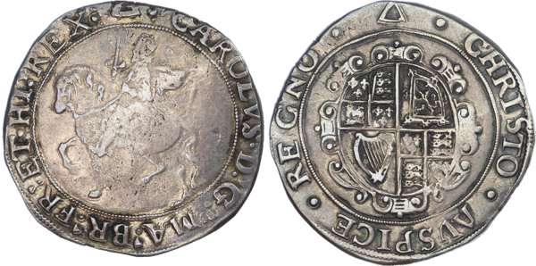 Charles I (1625 ‑1649), AR Halfcrown, 14.68gm., Tower Mint, group III, third style horseman ‑ type 3a2 ‑ horse with no caparisons, king with sword upright and narrow cloak flying from shoulders, rev. oval garnished arms, no CR. Mintmark triangle ‑ 1639‑40. (cf Brooker 349; N.2211; S.2775). Obv. a little weak, almost Very Fine, rev. strongly struck.