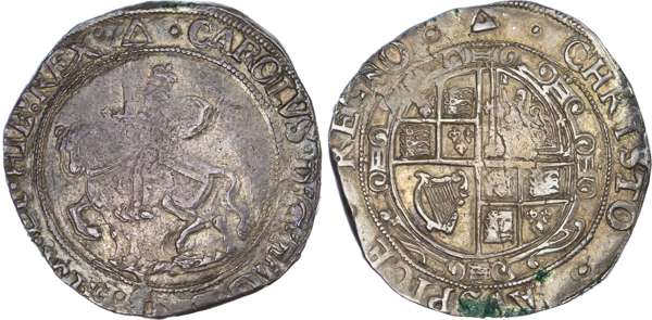 Charles I (1625 ‑1649), AR Halfcrown, 15.35gm., Tower Mint, group III, third style horseman ‑ type 3a2 ‑ horse with no caparisons standing on rough ground, king with sword upright and rounded cloak flying from shoulders, rev. oval garnished arms, no CR. Mintmark triangle ‑ 1639‑40. (cf Brooker 352; N.2212; S.2776). Very Fine, obv. a little double struck, rev. strongly struck.