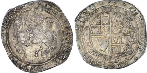 Charles I (1625 ‑1649), AR Halfcrown, 14.55gm., Tower Mint, group IV, fourth style horseman ‑ type 4 – horse foreshortened, with no caparisons, king with sword upright and double sash flying from shoulders, rev. oval garnished arms, no CR. Mintmark star ‑ 1640‑41. (cf Brooker 367; N.2214; S.2779). Very Fine, obv. a little double struck, rev. strongly struck.