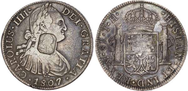 George III (1760-1820), Emergency Issue, Octagonal Countermark Dollar (8 Reales), 1807, Mexico City, laureate, draped and cuirassed bust of Charles IV right, octagonal countermark of George III in centre, rev. crowned square-topped shield dividing pillars, (Bull 1868; ESC 138; S.3766). Host coin good fine. Countermark very fine.