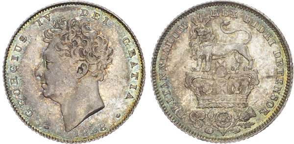 George IV (1820-1830), Sixpence, 1828, third reverse, bare head left, date below, rev. lion on crown, (ESC.1666, Bull.2438, S.3815). About extremely fine for issue. Light attractive olive/blue toning.