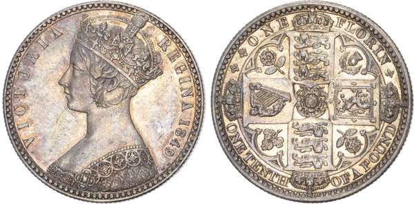 Victoria (1837-1901), 'Godless' Florin, 1849, crowned 'Gothic' bust left, W.W. after date, rev. crowned shields cruciform, emblems in angles, (ESC 802; Bull 2815; S.3890). About Extremely fine, light tone, some minor marks.