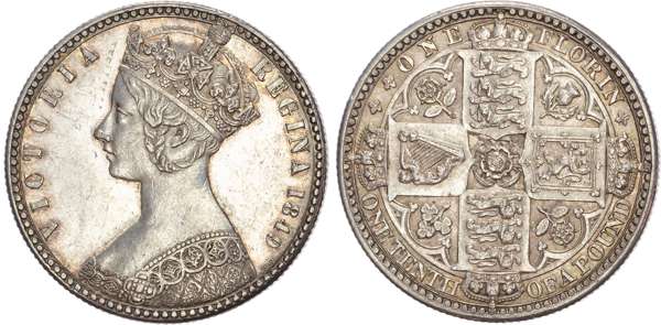 Victoria (1837-1901), 'Godless' Florin, 1849, crowned 'Gothic' bust left, W.W. after date, rev. crowned shields cruciform, emblems in angles, (ESC 802; Bull 2815; S.3890). Extremely fine, light tone, some minor marks.