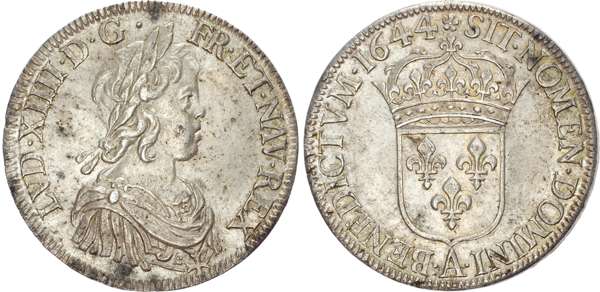 France, Louis XIV (1643-1715), silver Écu à la mèche courte, 1644 A, Paris, 27.49g (Dupl. 1461; Gad. 201). Good Extremely Fine, some dark spots.