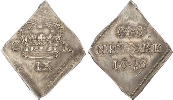 Large crown dividing CR, mark of value IX below, ten jewels on each arch of crown, rev. OBS: NEWARK 1646 in three lines. 4.45gm. (Nelson p.25, type b; N.2641; S.3144), Almost Extremely Fine, good vibrant grey cabinet toning.