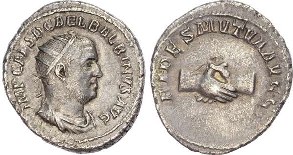 IMP CAES D C AEL BALBINVS AVG, radiate, draped and cuirassed bust of Pupienus right. Rev. FIDES MVTVA AVGG, clasped hands. (RIC 11). Very Fine.