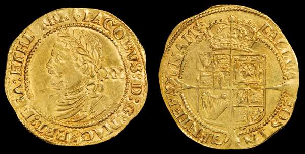 James I (1603-1625), AV Laurel, Third Coinage, Tower (London) mint, mm. lis (1623-4). Laureate fourth bust variety left, denomination behind, Rev. Crowned square-topped shield over long cross fourchée. (N. 2114; S. 2638C). Choice extremely fine or better. Graded by PCGS as MS 62.