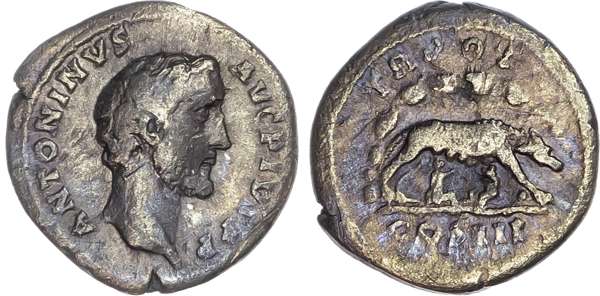 ANTONINVS AVG PIVS P P, laureate head of Antoninus Pius right. Rev. TR POT, She-wolf standing left in cave, suckling Romulus and Remus, COS III in exergue. (RIC 95 var.). Fine.