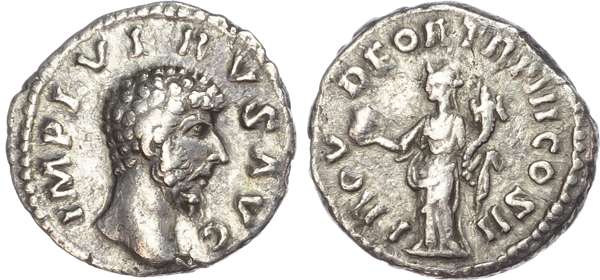 IMP L VERVS AVG, bare head of Lucius Verus right. Rev. PROV DEVOR TR P III COS II, Providentia standing left, holding globe and cornucopiae. (RIC 491). Very Fine.