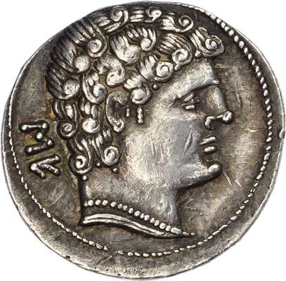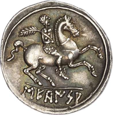 Male head right, ME (Iberian letters) behind. Rev. Horseman right, holding palm, SEKAISA (in Iberian letters) below. (Abh 2118). Extremely Fine. A few minor die breaks to the obverse. Well centred and exhibiting a beautiful old collection tone. A superb piece.