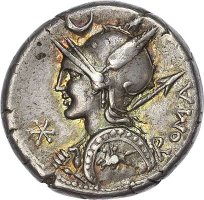 ROMA, helmeted bust of Roma facing left, holding spear over shoulder and shield decorated with horseman motif, mark of value in left field. Rev. NERVA, three citizens voting, one receiving a ballot from attendant below, another placing ballot in cista. (Crawford 292/1; Sydenham 548). Good Very Fine. A very pleasing portrait.