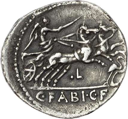 EX A PV, turreted, draped and veiled head of Cybele facing right. Rev. Victory, holding reins and whip, driving biga right, V below, stork to right, C•FABI•C•F in exergue. (Crawford 322/1b; Sydenham 590). Good Very Fine. Toned.