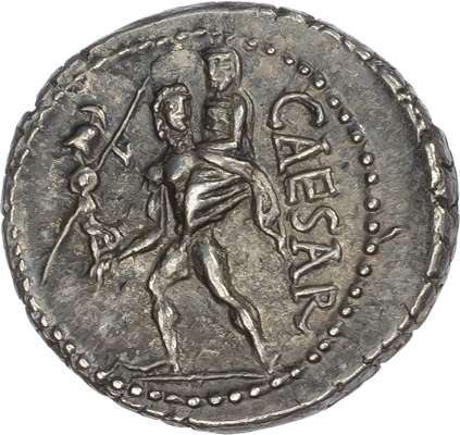 Diademed head of Venus facing right. Rev. CAESAR, Aeneas carrying his father, Anchises, and a palladium. (Crawford 458/1; CRI 55). Extremely Fine. A well centred example with pleasing cabinet toning.