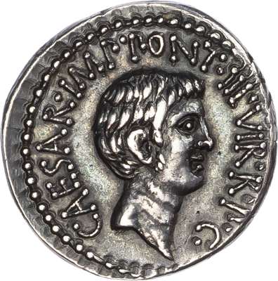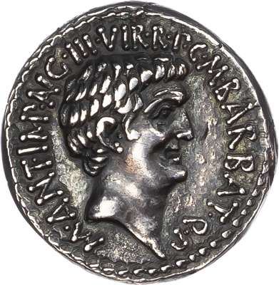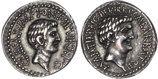 M•ANT•IMP•AVG•III•VIR•R•P•C•M•BARBAT•Q•P, bare head of Mark Antony facing right. Rev. CAESAR•IMP•PONT•III•VIR•R•P•C•, bare head of Octavian facing right. (Crawford 517/2; Sydenham 1181). Extremely Fine. Darkly toned. An exceptional example of the type with superb eye appeal.