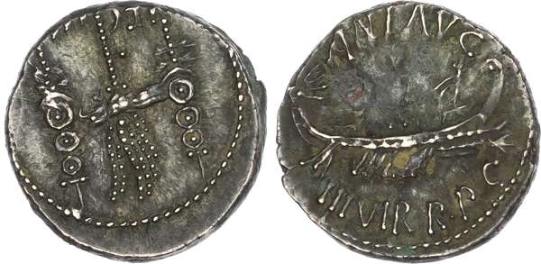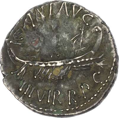 ANT AVG - III VIR•R•P•C, galley right. Rev. LEG III, aquila between two signa. (Crawford 544/15; Sydenham 1216). Good Very Fine. Some deposits.