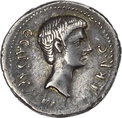 C CAESAR – III – RPC, bare head of Octavian right. Rev. SALVIVS - I - MP COS DESIG, thunderbolt. (Crawford 523/1a; Sydenham 1326b). Good Very Fine or better. Struck on a full flan. Attractive iridescent tone.