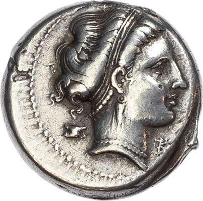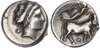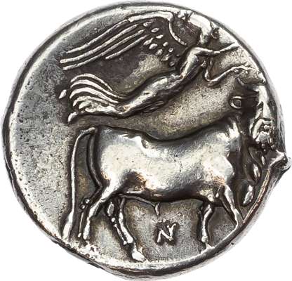 Diademed head of a nymph facing right, IE to right. Rev. NEΟΠΟΛITΩN, man-headed bull walking right, head facing, being crowned by Nike flying above, N between legs. (HN Italy 571; SNG ANS 344). Good Very Fine. Portrait of pleasing style. Reverse somewhat off-centre.